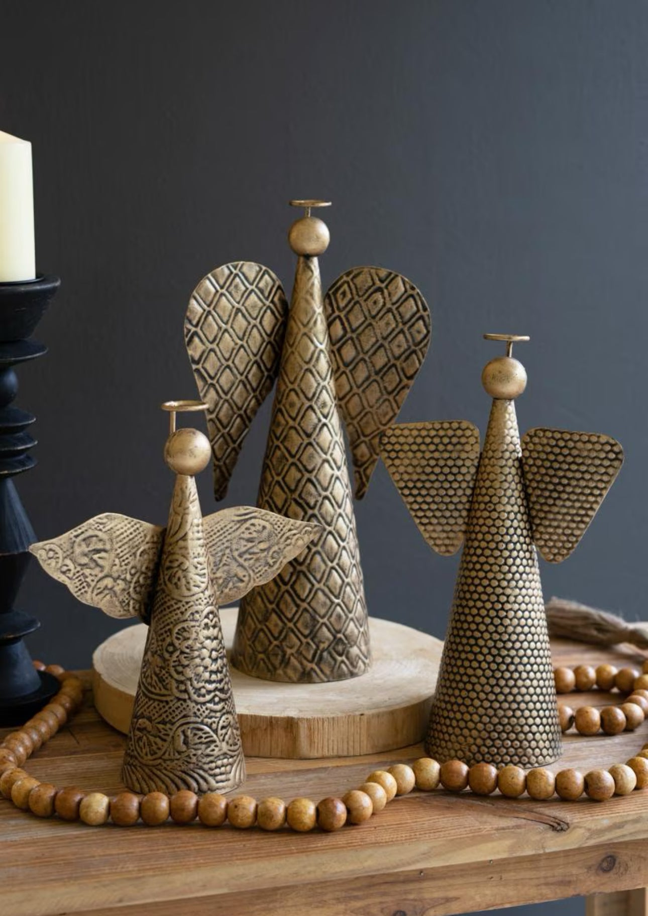 Use these antique gold angels for your tabletop display. Add this trio to your heavenly host collection or use it to begin your next arrangement. In three sizes, 17"14", and 12" tall, and textured patterns this set is a unique find