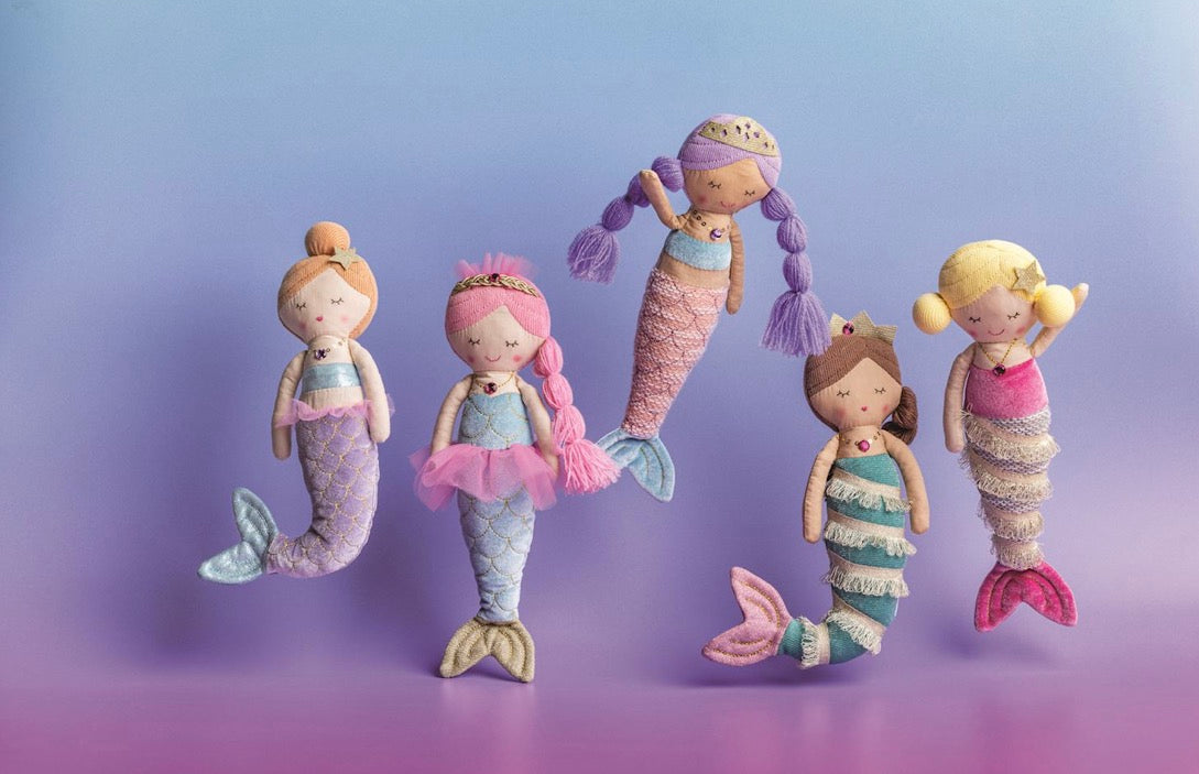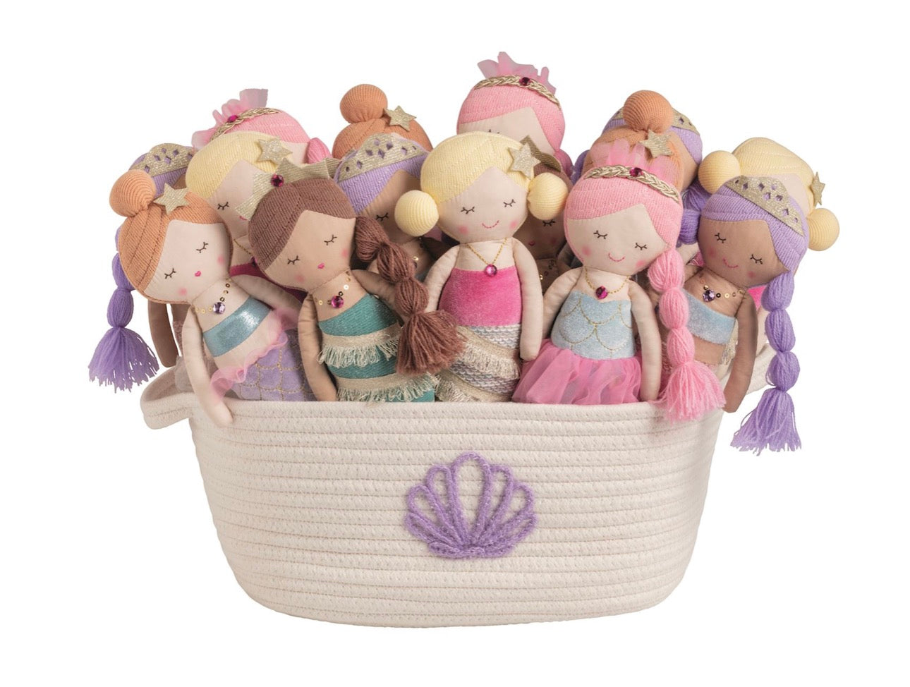 Faux linen mermaid doll features sweater knit yarn hair and shimmer and tulle fabric details. Comes in embroidered cotton rope display basket.