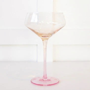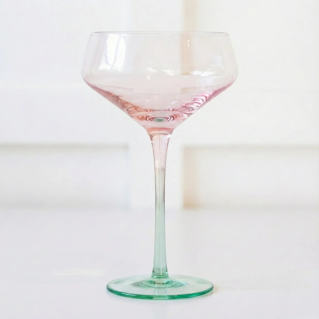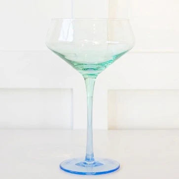 Hola! We are Mezclada Coupe Glasses, which means ‘mixed’ in Spanish. We are a mix of each of the colors in the Costarriqueña Collection: Flora, Quetzal, Cielo, and Rio. With our distinctive colors you will know exactly which of us is yours, and we'll be locatable from across the room. It’s a win-win. Well actually, a win-win-win-win because there are four of us. We come carefully protected in luxurious packaging, ready to make your acquaintance. Cheers!
