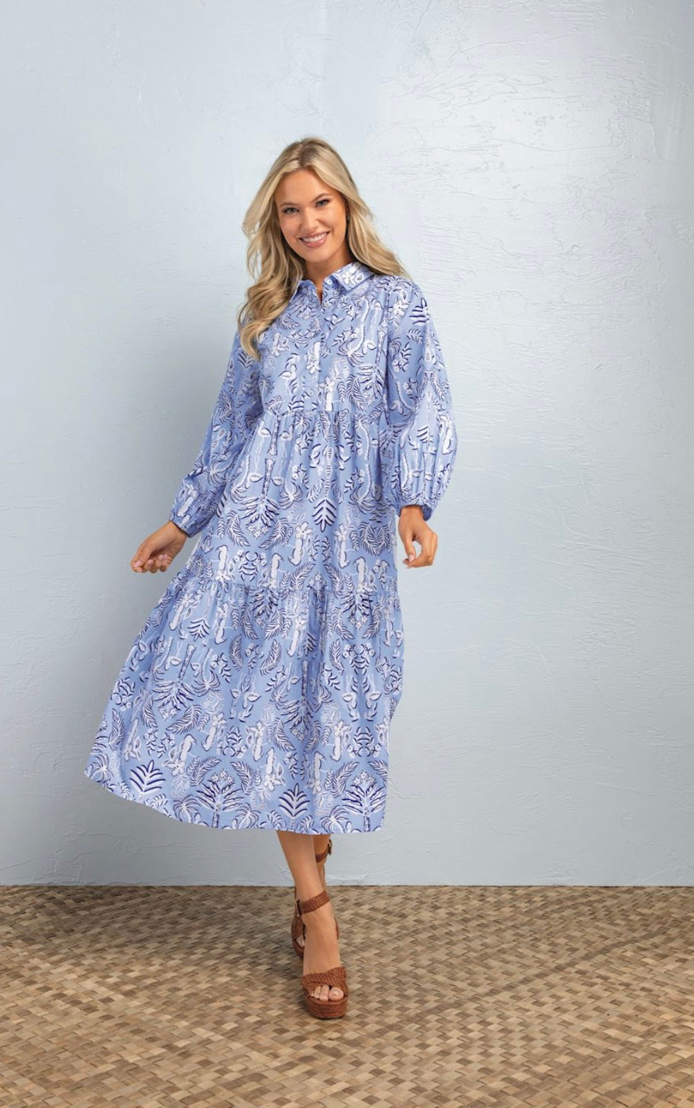Cotton poplin midi length shirt dress features pearlized button chest placket and bracelet length sleeves with elastic openings. Measures approximately 48" from shoulder to hem on size small.