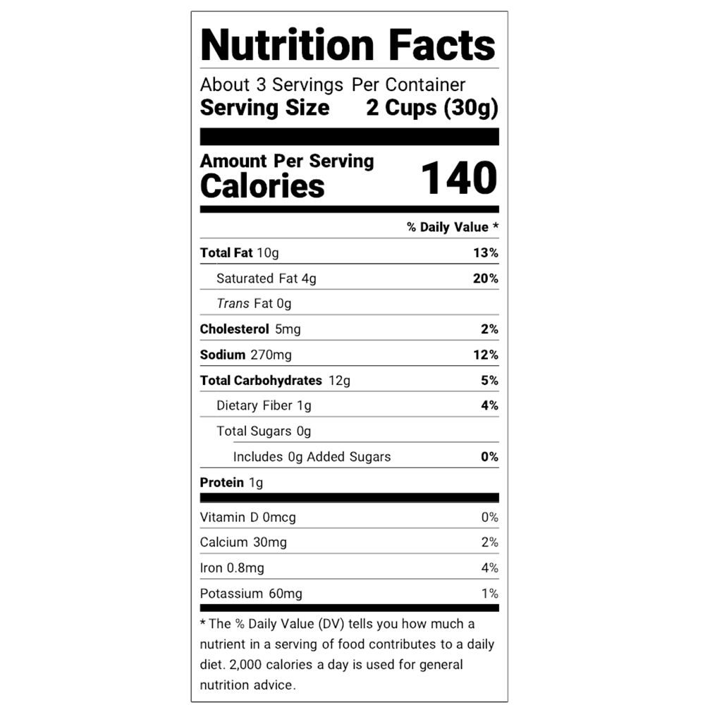 Fresh, tangy goodness. We love this crunchy snack so much we had to dedicate a flavor to it! White cheddar, vinegar and dill create this perfectly balanced (staff favorite!) flavor. Savory products have a total shelf life of 180 days from the production date. All wholesale orders are guaranteed to arrive with a minimum of 135 days of remaining shelf life.