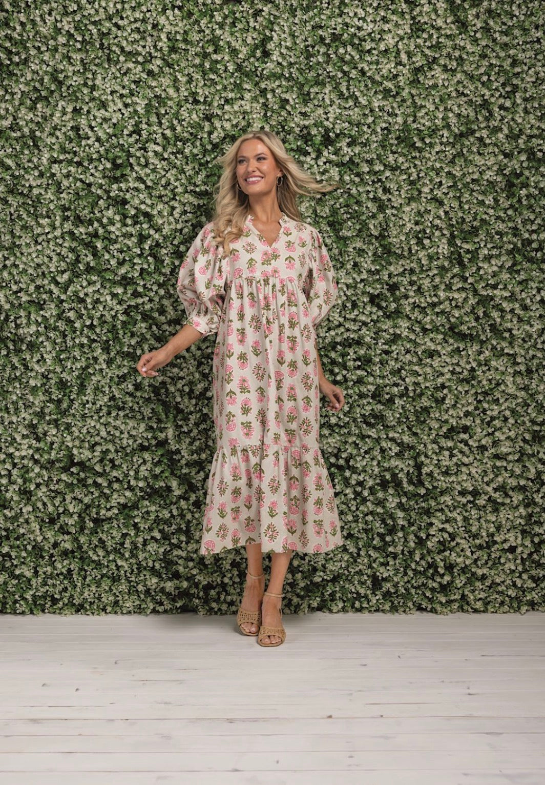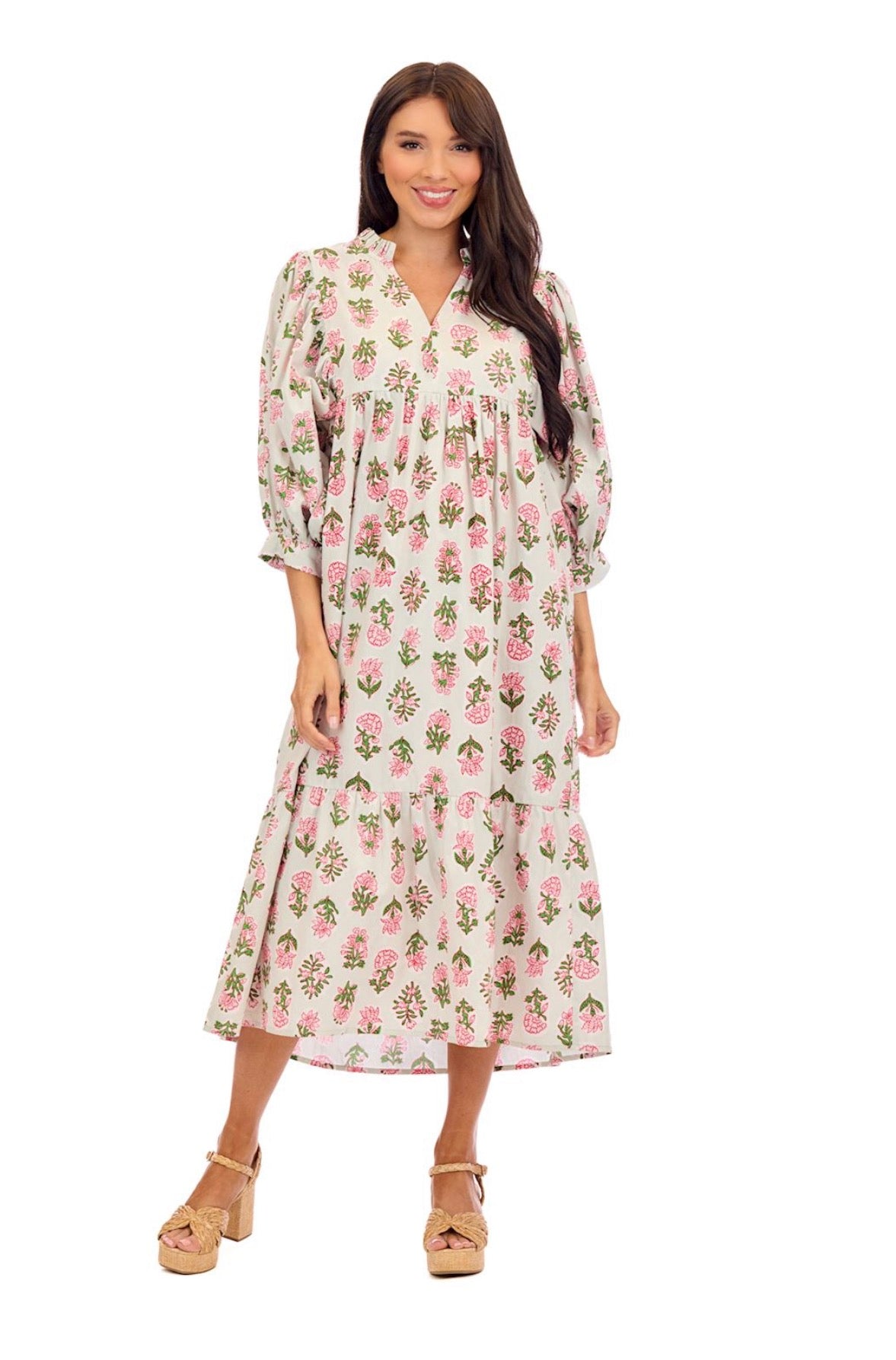 Cotton poplin midi dress features V-neck with ruffle collar and oversized puff sleeves. Measures approximately 48" from shoulder to hem on size small.