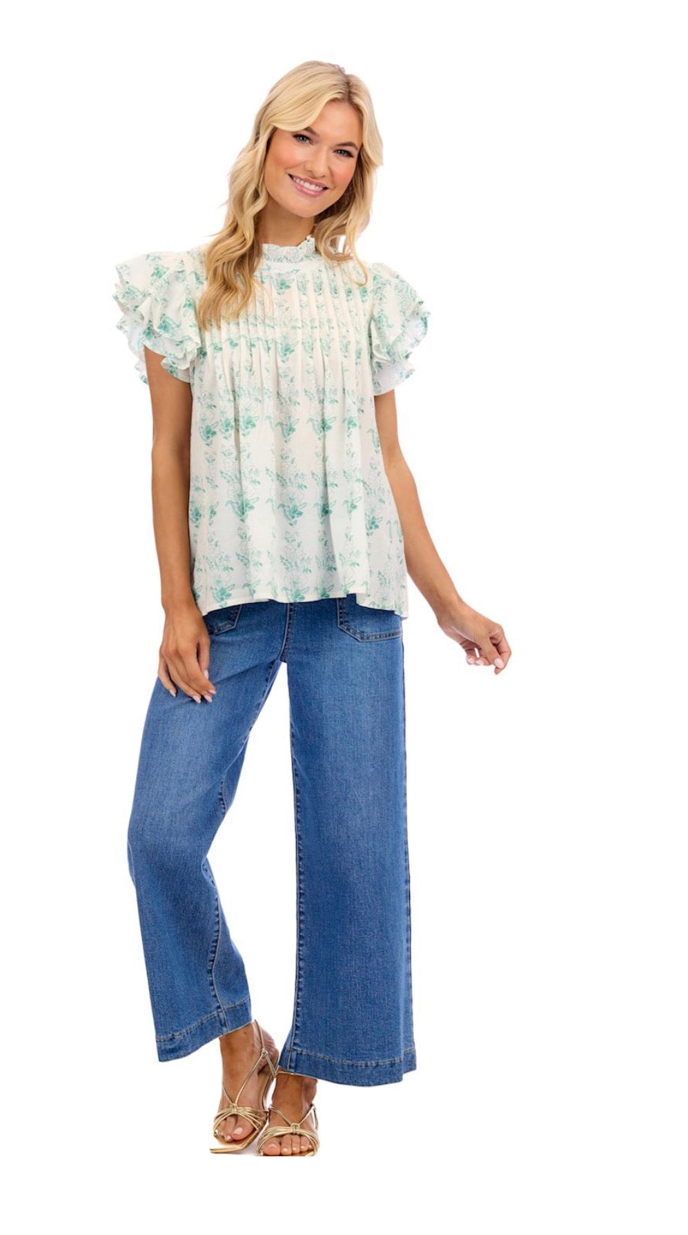 Cotton cambric top features layered flutter sleeves, pleating at front and back bodice and swing hem. Measures approximately 25" from shoulder to hem on size small.