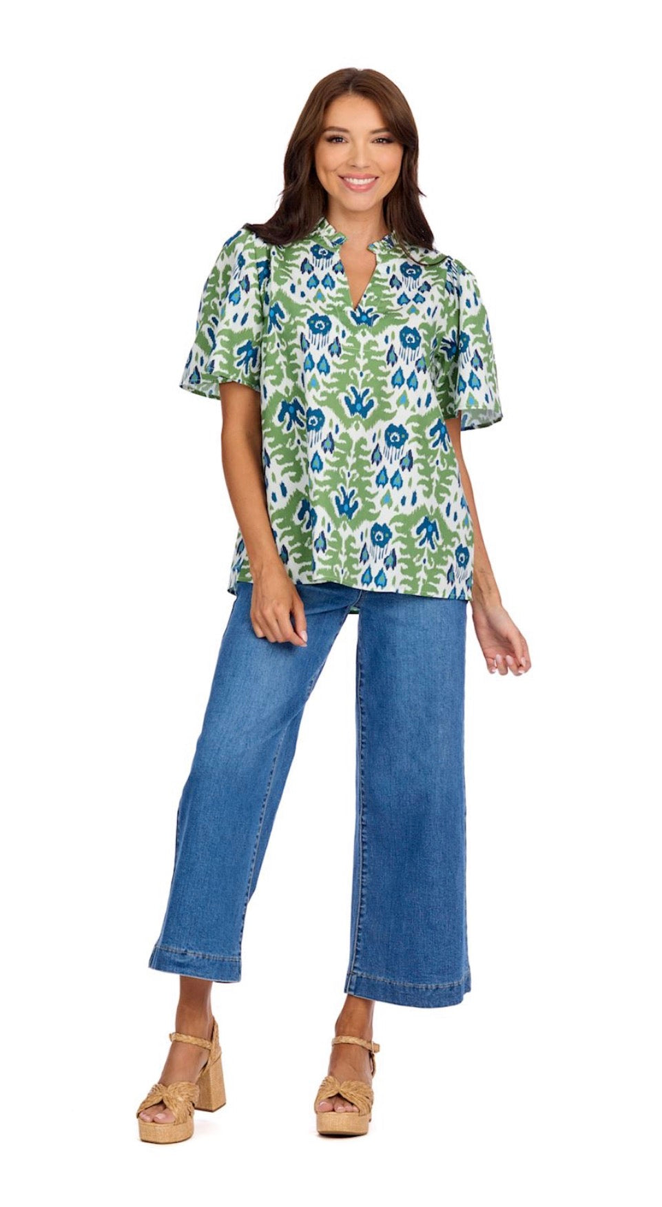 Cotton poplin printed top features flutter sleeves, V-neck and ruffle neckline. Measures approximately 26" from shoulder to hem on size small.
